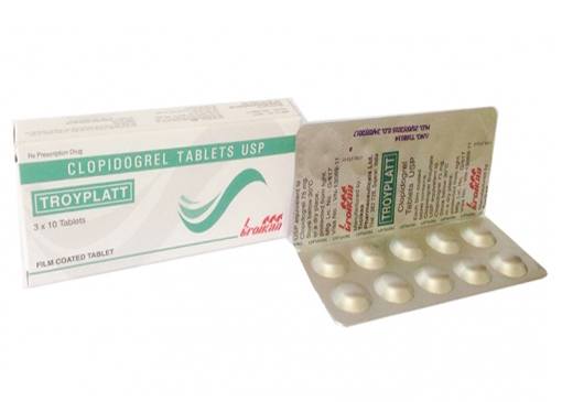 Aspirin: Có thể xảy ra tương tác dược lực học giữa Clopidogrel và Aspirin dẫn đến tăng nguy cơ xuất huyết. Do đó, cần thận trọng khi phối hợp 2 thuốc này. Tuy nhiên, Clopidogrel và Aspirin có thể được phối hợp trong thời gian kéo dài đến 1 năm. Heparin: Tương tác dược lực học giữa Clopidogrel và Heparin có thể dẫn đến tăng nguy cơ xuất huyết. Do đó, việc sử dụng đồng thời cần được lưu ý. Warfarin: Có thể gây tăng nguy cơ xuất huyết nên sử dụng đồng thời Clopidogrel và Warfarin cần được lưu ý. Các thuốc kháng viêm không Steroid (NSAIDs);: Nghiên cứu ở những người tình nguyện khỏe mạnh sử dụng Naproxen, việc sử dụng đồng thời Naproxen và Clopidogrel có thể làm tăng xuất huyết đường tiêu hóa tiềm tàng. Do đó cần thận trọng khi sử dụng đồng thời Clopidogrel với các thuốc kháng viêm không steroid. Các thuốc chuyển hóa bởi hệ Cytochrom P450: Với nồng độ cao trong thử nghiệm in vitro, Clopidogrel ức chế Cytochrom P450 (2C9). Cho nên nó có thể ảnh hưởng đến quá trình chuyển hóa của phenytoin, tamoxifen, tolbutamid, warfarin, torsemid, fluvastatin và nhiều chất kháng viêm không steroid khác, nhưng không có dữ liệu về mức nghiêm trọng của các tương tác trên. Cần lưu ý khi phối hợp Clopidogrel với các thuốc trên. Kết hợp điều trị khác: sử dụng đồng thời với thuốc ức chế hoạt động của enzyme CYP2C19 có thể làm giảm nồng độ chất chuyển hóa hoạt động Clopidogrel. Vì thế nên thận trọng khi dùng đồng thời với những thuốc ức chế CYP2C19 bao gồm Omeprazole và Esomeprazole, fluvoxamine, fluoxetine, moclobemide, voriconazole, fluconazole, ticlopidine, ciprofloxacin, cimetidine, carbamazepine, oxcarbazepine và chloramphenicol.Công dụng Troyplatt