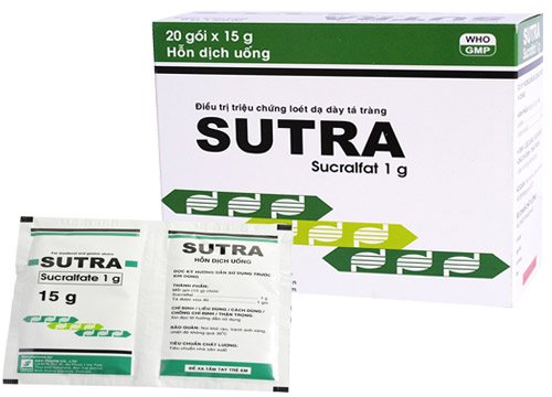 Có thể dùng các antacid cùng với sucralfat trong điều trị loét tá tràng để giảm nhẹ chứng đau. Nhưng không được uống cùng một lúc vì antacid có thể ảnh hưởng đến sự gắn của sucralfat trên niêm mạc. Nên dặn người bệnh uống antacid trước hoặc sau khi uống sucralfat một nửa giờ. Các thuốc cimetidin, ranitidin, ciprofloxacin, norfloxacin, ofloxacin, digoxin, warfarin, phenytoin, theophylin, tetracyclin khi uống cùng với sucralfat sẽ bị giảm hấp thu. Vì vậy phải uống những thuốc này 2 giờ trước hoặc sau khi uống sucralfat.Công dụng Sutra