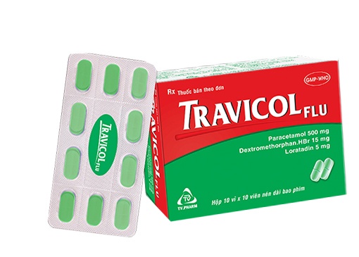 Một số tương tác đã được báo cáo, bao gồm: - Paracetamol: + Metoclopramid, Domperidon: Tăng tốc độ hấp thu của Paracetamol. + Cholestyramin: Giảm hấp thu của Paracetamol. + Các thuốc chống đông: Tăng tác dụng nếu sử dụng Paracetamol dài ngày vì tăng nguy cơ chảy máu. Tuy nhiên ở liều thông thường ảnh hưởng không có ý nghĩa. - Loratadin: + Thuốc ức chế CYP3P4, CYP2D6: Tăng nồng độ Loratadin, do đó tăng các tác dụng phụ. + Ketoconazol, Erythromycin, Cimetidin: Làm tăng nồng độ Loratadin trong huyết tương. - Dextromethorphan HBr: + Rượu: Tăng tác dụng an thần của thuốc này. + Các thuốc IMAOs, thuốc chống trầm cảm, thuốc SSRIs: Nguy cơ xảy ra hội chứng Serotonin dẫn đến thay đổi trạng thái tinh thần, cơn rùng mình, run, tăng huyết áp, rung giật cơ, tăng phản xạ, bồn chồn, toát mồ hôi. + Các thuốc ức chế CYP2D6 như Fluoxetin, Methadon, Paroxetin, Quinidin,... làm tăng nồng độ của Dextromethorphan, làm tăng các tác dụng không mong muốn của thuốc (như mất ngủ, kích động, rung, tiêu chảy, nhầm lẫn, suy hô hấp); và phát triển hội chứng Serotonin. + Quinidin: Tăng nồng độ lên gấp 20 lần Dextromethorphan trong huyết tương làm tăng tác dụng phụ về rối loạn hệ thần kinh trung ương của thuốc này. Để đảm bảo an toàn và hiệu quả, hãy báo với bác sĩ về tất cả các loại thuốc, thực phẩm bảo vệ sức khỏe đang dùng và các bệnh khác đang mắc phải.Công dụng Travicol Flu