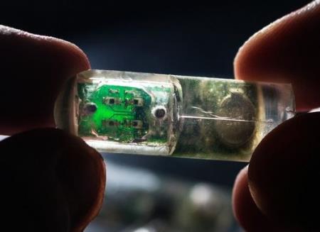 Những tế bào đã biến đổi này lại được đưa vào bên trong một viên nang an toàn cho cơ thể. Một nửa viên nang có màng bán thấm cho phép dịch lỏng trong ruột đi vào. Nửa còn lại chứa các linh kiện bán dẫn truyền tín hiệu không dây đặt bên trong một vỏ trong suốt có thể nhìn qua được.
